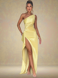 Der hochwertige Satinstoff umfließt deine Figur in schmeichelnder, figurbetonter Silhouette und bringt mit seinem eleganten Faltenwurf Bewegung und Tiefe in deinen Look. Der hohe Beinschlitz und die asymmetrische Schulterpartie sorgen für einen sinnlichen Auftritt – ideal für Sommerabende, Hochzeiten oder besondere Events.